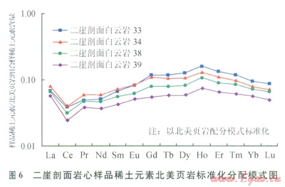 稀土元素能有效區(qū)分熱水成因沉積物與非熱水水成沉積的沉積物,前者REE總量低,Ce為負(fù)異常,Eu為正異常,HREE富集;后者REE含量高,Eu為負(fù)異?;驘o(wú)異常,HREE不富集[9-12]。川東地區(qū)多條野外露頭剖面(華鎣山二崖、華鎣山閻王溝、華鎣山仙鶴洞、石柱冷水溪)和鉆井巖心樣品白云巖(圖6,以華鎣山二崖剖面為例)的稀土元素北美頁(yè)巖標(biāo)準(zhǔn)化分配模式均可以看出,其沉積以熱水沉積為主,混有少量非熱水的水成沉積物。