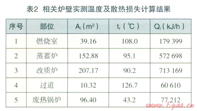 吳煤公司的天然氣改質(zhì)爐是常壓改質(zhì)爐,該工藝過(guò)程的熱效率76.37%,生產(chǎn)城市燃?xì)庑?span lang="EN-US">84.74%。對(duì)照國(guó)內(nèi)常壓改質(zhì)爐生產(chǎn)數(shù)據(jù),屬于較好水平生產(chǎn)燃?xì)狻_@種能源轉(zhuǎn)換設(shè)備不同于其他燃?xì)馍a(chǎn)設(shè)備,無(wú)固體灰渣排出,因此,熱量損失評(píng)價(jià)可以從排煙熱損失(顯熱損失和化學(xué)不完全燃燒熱損失)及爐肇散熱損失進(jìn)行考察。測(cè)試數(shù)據(jù)顯示,僅有部分爐體外壁溫度有所偏高,較易克服以減少熱量損失。從占熱量損失的比值來(lái)看分別為機(jī)械發(fā)生爐為45%,鍋爐為59.53%,天然氣改質(zhì)爐為18.52%,由此可見(jiàn),天然氣改質(zhì)爐的能源轉(zhuǎn)換和熱量利用最好。
