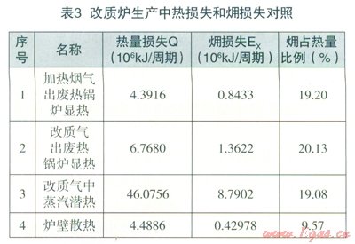 (2)從改質(zhì)爐生產(chǎn)中熱損失和損失計(jì)算結(jié)果(表3)可見(jiàn),無(wú)論是熱量損失還是火用損失,改質(zhì)氣中蒸汽的潛熱損失和損失占極大部分。因此,在改質(zhì)爐生產(chǎn)中節(jié)能的關(guān)鍵在于調(diào)節(jié)到最適宜的操作參數(shù),在滿足改質(zhì)氣質(zhì)量指標(biāo)的情況下,盡可能提高水蒸汽分解率,可以提高操作溫度和降低水蒸汽與天然氣之比來(lái)實(shí)現(xiàn),從而降低改質(zhì)爐生產(chǎn)中有效能(火用)損失。另外,在停產(chǎn)檢修時(shí),盡量做好廢熱鍋爐的清掃工作,改善傳熱效果,盡可能降低加熱煙氣和改質(zhì)氣出廢熱鍋爐的出Vl溫度,從而降低這兩部分的熱量損失和能量利用率。從爐體表面溫度測(cè)試記錄可知,燃燒室、蒸蓄爐、改質(zhì)爐、過(guò)道的表面溫度分別為108.0℃、95.0℃、90.2℃、l26.6℃,這些表面溫度偏高,可以在停產(chǎn)檢修時(shí)考慮改善保溫材料的保溫性能,降低爐壁表面溫度,降低爐壁散熱損失,使熱量得到有效利用。