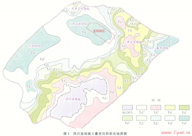 中三疊世末,伴隨著印支運(yùn)動(dòng)的發(fā)生,地臺整體抬升形成大規(guī)模的海退,上揚(yáng)子地臺由此結(jié)束了以海相沉積為主的歷史,進(jìn)入以陸相沉積為主的時(shí)期,地層遭受剝蝕。在此過程巾形成了隆起與凹陷,盆地內(nèi)展現(xiàn)為三隆三凹的格局(圖1)。三隆指南側(cè)瀘州古隆起、北側(cè)開江古隆起以及北西邊緣廣元江油附近的天井山古隆起,三凹是指川西凹陷(包括德陽—成都—大邑—邛崍—眉山—雅安地區(qū)和樂山—犍為地區(qū))、川中北部凹陷(包括蒼溪—閬中—儀隴地區(qū))和川東北的奉節(jié)凹陷。隆起中心地層遭受剝蝕程度大,瀘州古隆起頂部雷口坡組剝蝕殆盡,開江占隆起殘存雷一段,在凹陷內(nèi)剝蝕程度相對較弱,均保留了雷四段。