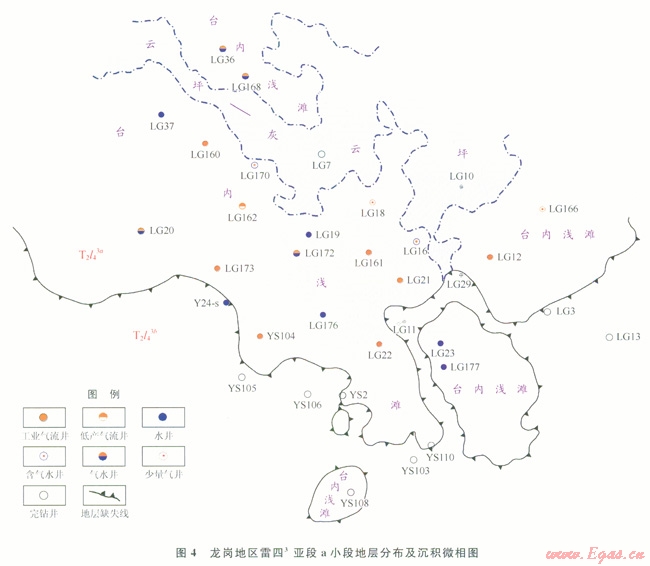 3)在大型地層尖滅的背景上,受構(gòu)造、斷層和巖性變化影響,發(fā)育地層 構(gòu)造、巖性一構(gòu)造等多種圈閉類型。雷四3亞段a小段尖滅帶附近的次級巖溶斜坡是尋找工業(yè)氣井的最有利區(qū)。