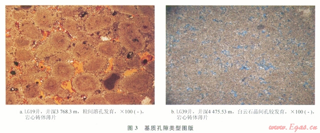 儲層基質(zhì)孔隙類型有粒間溶孔、晶間溶孔、粒內(nèi)溶孔、鑄??缀腕w腔孔,其中粒間溶孔、晶間溶孔是主要的孔隙類型,其發(fā)育程度直接影響到儲層的儲集能力。