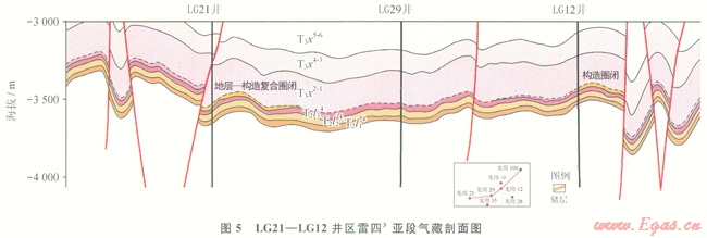 四川盆地雷口坡組大多數(shù)氣藏圈閉類型為構(gòu)造圈閉,根據(jù)雷四3亞段a小段地層、沉積微相、儲層對比分析、巖心物性分析和測井綜合解釋成果、綜合鉆井測試、氣水分布特征、地震儲層預(yù)測成果和構(gòu)造分析,認(rèn)為雷四3亞段氣藏圈閉類型較為復(fù)雜,在大型地層尖滅的背景上,受構(gòu)造、斷層和巖性變化影響,發(fā)育地層 構(gòu)造、巖性 構(gòu)造、構(gòu)造等多種圈閉類型(圖5、6)。