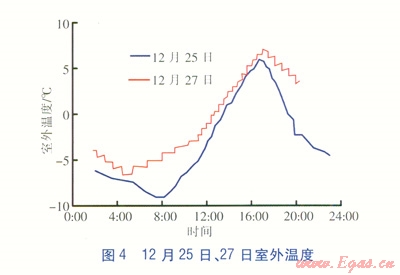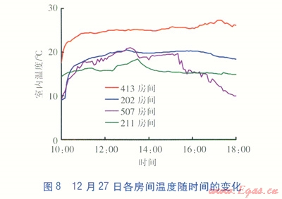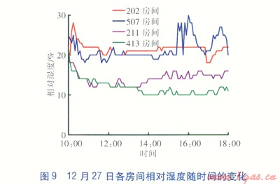 12月27日10:O0室內(nèi)溫度為9.05℃,l3:O0左右溫度持續(xù)在20℃左右,l6:30以后室內(nèi)溫度逐漸下降,l8:00室內(nèi)溫度為18.31℃。相對(duì)濕度基本在25%以下。