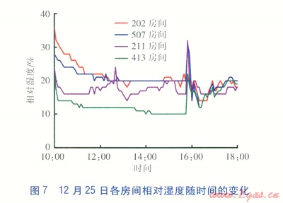 12月25日室內(nèi)溫度從l0:00的15.69℃上升至15:45的28.06℃,之后開(kāi)始下降。截至18:00,室內(nèi)溫度為16.81℃。房間相對(duì)濕度很低,約l0%左右,至l5:50開(kāi)始相對(duì)濕度突然有所增加,并逐步上升到20%。