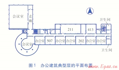 選擇4個(gè)房間(位置見(jiàn)圖l)進(jìn)行室內(nèi)熱環(huán)境監(jiān)測(cè),被測(cè)房間分別為:南向202、507房間,建筑面積均為64m2;北向211、413房間,建筑面積分別為124、64m2。規(guī)定507房間不開(kāi)啟風(fēng)機(jī)盤管,其他房間均可開(kāi)啟風(fēng)機(jī)盤管供暖。