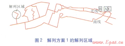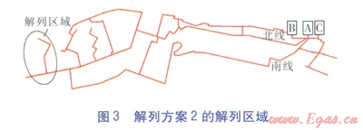 按照解列最不利熱用戶的原則,并根據(jù)閥門設(shè)置情況,選取解列方案1、2。兩種解列方案中解列區(qū)域分別見圖2、3。解列方案1、2的解列區(qū)域分別包括15、34個(gè)熱用戶,被解列熱用戶總設(shè)計(jì)質(zhì)量流量分別為10302220th。解列區(qū)域最低限額供熱系數(shù)仍取0.807,則解列方案12的解列區(qū)域事故工況下的質(zhì)量流量分別為832、1792th。