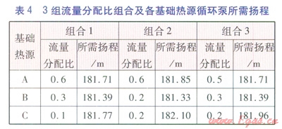 根據(jù)各基礎(chǔ)熱源設(shè)計(jì)質(zhì)量流量,經(jīng)計(jì)算可得,基礎(chǔ)熱源AC的流量分配比限額(最大值)分別為0.6、0.30.2。在南線出口事故工況下,按照10%步長改變各基礎(chǔ)熱源流量分配比,可得到3組流量分配比組合。按照文獻(xiàn)[8]的計(jì)算方法,分別計(jì)算3組流量分配比組合中各基礎(chǔ)熱源循環(huán)泵所需揚(yáng)程。3組流量分配比組合及各基礎(chǔ)熱源循環(huán)泵所需揚(yáng)程見表4。