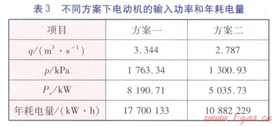 電動(dòng)機(jī)軸功率乘以年最大熱負(fù)荷利用時(shí)即為估算的年耗電量(見表3)。由此可見,方案一要比方案二每年多消耗電能6817904kW·h,按照平均電價(jià)為0.9元/(kW·h)計(jì)算,兩個(gè)方案的電費(fèi)差額為613.61×104/a