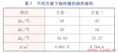 從表2可以看出,在換熱器的換熱面積方面,方案二比方案一多2143.6m2。換熱板片的平均價(jià)格為700元/m2,按此計(jì)算,在換熱器方面方案二比方案一增加造價(jià)約150×104元。