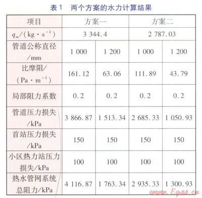 對(duì)于一級(jí)管網(wǎng),確定主干線管徑時(shí),宜采用經(jīng)濟(jì)比摩阻(3070 Pam)計(jì)算。兩個(gè)方案的水力計(jì)算結(jié)果見表1。