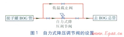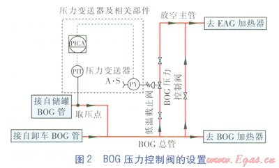 BOG壓力控制閥為氣動(dòng)式薄膜凋節(jié)閥,設(shè)置于自力式降壓調(diào)節(jié)閥后、BOG總管的支管路上,進(jìn)口與BOG總管連接,出口與放空主管連接,取壓點(diǎn)設(shè)置在BOG壓力控制閥前儲(chǔ)罐BOG管上,當(dāng)取壓點(diǎn)壓力達(dá)到設(shè)定值時(shí),閥門開啟,實(shí)現(xiàn)少量放散。BOG壓力控制閥的設(shè)置見圖2(2EAG指安全放散氣體)。