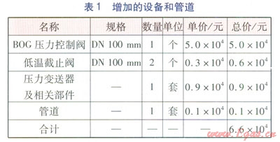 設(shè)置BOG壓力控制閥,需要增加一套BOG壓力控制系統(tǒng),即需要增加相應(yīng)的設(shè)備和管道,因此相應(yīng)的造價(jià)也要增加。增加的設(shè)備和管道見表1