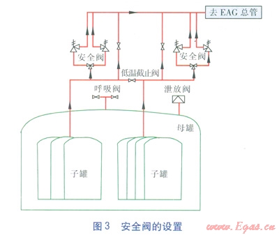 為使儲(chǔ)罐安全,防止超壓,確保穩(wěn)定、可靠供氣,設(shè)置了四級(jí)安全保障系統(tǒng),即自力式降壓調(diào)節(jié)閥BOG壓力控制閥安全閥泄放閥和呼吸閥。該安全保障系統(tǒng)比常規(guī)安全保障系統(tǒng)增加了BOG壓力控制閥。