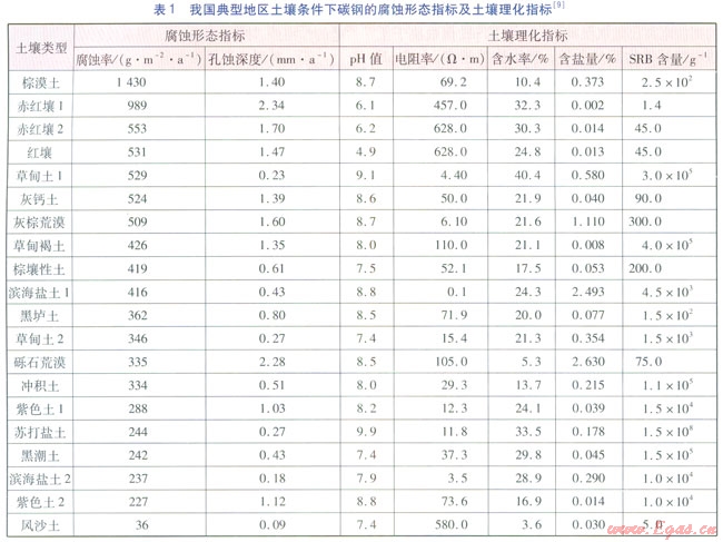 我國(guó)典型地區(qū)土壤條件下碳鋼的腐蝕形態(tài)指標(biāo)及土壤理化指標(biāo)見(jiàn)表1[9]。