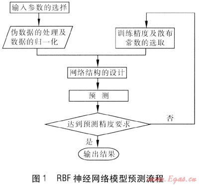 RBF網(wǎng)絡(luò)和普通的前向網(wǎng)絡(luò)有所不同,隱層神經(jīng)元是徑向基神經(jīng)元而不是tansig或者logsig神經(jīng)元。普通前向網(wǎng)絡(luò)中sigmoid神經(jīng)元能夠覆蓋較大的輸入?yún)^(qū)域,但是普通前向神經(jīng)元數(shù)目在訓(xùn)練前就已經(jīng)固定下來(lái)。而徑向基神經(jīng)元雖然只對(duì)相對(duì)較小的區(qū)域產(chǎn)生響應(yīng),但是在輸入?yún)^(qū)間較大時(shí),可以適當(dāng)?shù)卦黾訌较蚧窠?jīng)元來(lái)調(diào)整網(wǎng)絡(luò),從而達(dá)到精度要求。且RBF網(wǎng)絡(luò)的設(shè)計(jì)比普通前向網(wǎng)絡(luò)訓(xùn)練要省時(shí)得多[6]。RBF網(wǎng)絡(luò)模型預(yù)測(cè)流程見(jiàn)圖1。