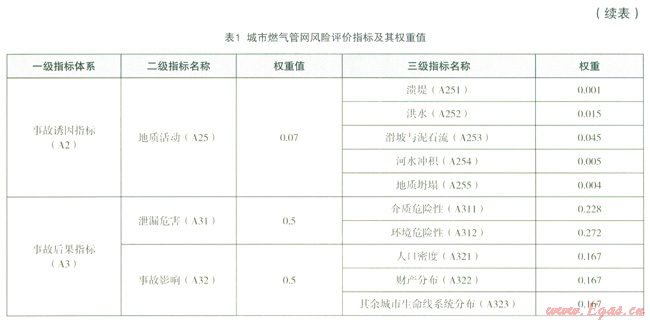城市管網(wǎng)風(fēng)險(xiǎn)因素間權(quán)重的選擇,參考國內(nèi)外經(jīng)驗(yàn)[6],[8],各指標(biāo)權(quán)重分配見表1。