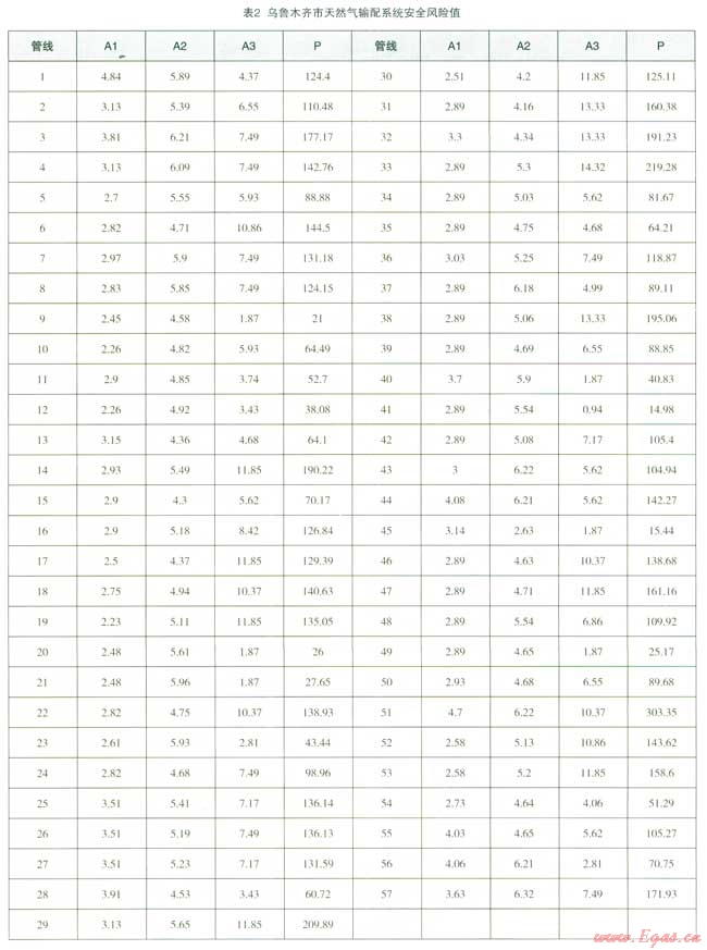 根據(jù)風(fēng)險(xiǎn)評估方法,計(jì)算出烏魯木齊市57條滅然氣管道的風(fēng)險(xiǎn)值(2)。由表2可知,管網(wǎng)脆弱性指標(biāo)以1號管線最大,為4.84,其次是51號管線,為4.70,主要是因?yàn)楣芫€管輸氣體壓力大,管線使用年限較長,19號管線管輸氣體壓力小,最小埋深大管網(wǎng)脆弱性指標(biāo)最小,為2.23。事故誘因指標(biāo)以57號管線最大,為6.32,其次是51號管線,為6.22,主要是因?yàn)榻ㄖ┕?、地面活動情況和供水、排水沒施建設(shè)活動較頻繁,15號管線位于郊區(qū),外界干擾少,事故誘因指標(biāo)最小,為2.63。事故后果指標(biāo)以3,號管線最大,為14.32,其次是38號管線,為13.33,主要是因?yàn)槿細(xì)夤芫W(wǎng)位于居住區(qū)、商業(yè)區(qū)內(nèi),人口密度和財(cái)產(chǎn)密度較高,泄漏危害嚴(yán)重;41號管線位于人煙稀少地區(qū),事故后果指標(biāo)最小,為0.94。全部管網(wǎng)風(fēng)險(xiǎn)平均值為112,1條天然氣管道風(fēng)險(xiǎn)評估值大于300,說明有較高的風(fēng)險(xiǎn);2條天然氣管道風(fēng)險(xiǎn)評估值在200300之間,說明風(fēng)險(xiǎn)一般;54條天然氣管道風(fēng)險(xiǎn)值小于200,說明相對安全。綜合以上,由于管道周圍運(yùn)行環(huán)境不同,其風(fēng)險(xiǎn)也是不一樣的,51號管段的脆弱性指標(biāo)、事故誘因指標(biāo)和事故后果指標(biāo)較大,知此管段的風(fēng)險(xiǎn)等級較高。