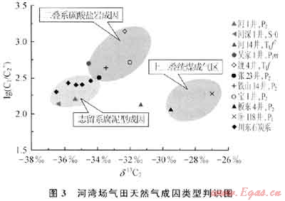 沈平(2005)根據(jù)天然氣乙烷碳同位素特征,將四川盆地海相地層天然氣劃分為3種類型。第一類是δ13C1<-34.0‰,最輕為-37.0‰左右(如福成寨石炭系),川東絕大部分石炭系,尤其是川東北地區(qū)基本屬于這一類。王廷棟等(1994)曾利用儲層瀝青和氣體地球化學特征綜合判斷為志留系腐泥型烴源巖成因。第二類是δ13C2>-30.0‰,如典型的煤成氣板東4井P22和臥龍河部分下二疊統(tǒng)天然氣,前人研究表明它們主要屬于上二疊統(tǒng)龍?zhí)督M煤系有機質成因(楊遠聰?shù)龋?989;王廷棟等,1994;鄭永堅,1995;王蘭生等,1997)。第三類δ13C2介于-34.0‰~-30.0‰,主要分布在川東北二疊系和下三疊統(tǒng)飛仙關組中,在平面上環(huán)開江-梁平海槽分布或直接分布在開江-梁平海槽中,該類氣體碳同位素組成特征與來源于志留系的腐泥型天然氣和來源于上二疊統(tǒng)龍?zhí)督M煤成氣(腐殖氣)明顯不同。河灣場氣田奧陶系、二疊系地層天然氣δ13C1介于-35.65‰~-35.40‰,δ13C2介于-35.35‰~-36.34‰,乙烷碳同位素明顯低于-34‰,具有典型的腐泥型天然氣特征。與此同時該區(qū)天然氣乙烷碳同位素與川東和川東北地區(qū)二、三疊系天然氣存在明顯的差別,明顯偏輕。河灣場氣田乙烷碳同位素與川東北地區(qū)石炭系天然氣乙烷碳同位素大致相當(表2、圖3)。其相同或者相近的乙烷碳同位素特征預示它們有著相同的來源。