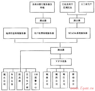 硬件網(wǎng)絡(luò)以地理信息系統(tǒng)服務(wù)器、用戶收費系統(tǒng)服務(wù)器和SCAD系統(tǒng)服務(wù)器為核心,采用一條50M和一條8M專用光纜與電信運營商連接,50M光纜分兩區(qū),其中16M帶寬用于收費服務(wù)器與8家聯(lián)網(wǎng)收費銀行聯(lián)系傳遞信息,34M帶寬用于辦公網(wǎng)絡(luò)上互聯(lián)網(wǎng)和燃氣綜合管理系統(tǒng)、用戶收費系統(tǒng)、SCAD系統(tǒng)通過VPN設(shè)備與遍布市區(qū)的東南西北四個分公司及營業(yè)服務(wù)廳聯(lián)網(wǎng)。8M光纜專門用于與各SCAD系統(tǒng)遙測遙控點數(shù)據(jù)傳輸和與集團公司SCAD控制中心數(shù)據(jù)交換(通過互聯(lián)網(wǎng))。