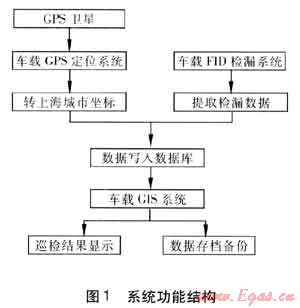 利用公司現(xiàn)有的數(shù)據(jù)和軟件平臺(tái),將車載FID、車載GPS、GIS信息系統(tǒng)三者相結(jié)合,構(gòu)建起市北公司燃?xì)夤芫W(wǎng)泄漏的早期預(yù)警系統(tǒng)。其工作原理為FID檢漏儀檢測到管網(wǎng)泄漏點(diǎn)后,系統(tǒng)將完成兩項(xiàng)任務(wù),一方面自動(dòng)讀取車載檢漏儀所采集到的數(shù)據(jù),將其寫入數(shù)據(jù)庫;另一方面,安裝在檢漏車上的GPS定位儀自動(dòng)記錄泄漏點(diǎn)的空間坐標(biāo),并轉(zhuǎn)換為上海城市坐標(biāo),供安裝于車載筆記本電腦上的GIS系統(tǒng)使用。GIS系統(tǒng)將GPS傳送的空間坐標(biāo)以及FID采集到的泄漏數(shù)據(jù)整合,進(jìn)行專業(yè)分析、專題顯示,形成相關(guān)的報(bào)告報(bào)表。圖1表示了整個(gè)系統(tǒng)的功能結(jié)構(gòu)。