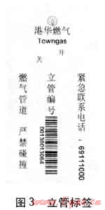 依據(jù)立管管徑的不同,使用不同規(guī)格的立管標(biāo)簽。標(biāo)簽上含有燃?xì)夤痉?wù)熱線、立管編碼的條形碼、燃?xì)夤拘畔?、警示語(yǔ)等。目前公司已在轄區(qū)的居民小區(qū)內(nèi)試用,先將各立管信息打印于立管標(biāo)簽,再將立管標(biāo)簽粘貼于立管上。