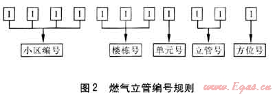 為了更好地對(duì)立管進(jìn)行管理,對(duì)立管進(jìn)行有規(guī)則的編號(hào)顯得非常必要。編號(hào)可與客服管理系統(tǒng)相結(jié)合,公司依據(jù)客服管理系統(tǒng)以及立管情況進(jìn)行編號(hào)。燃?xì)饬⒐芫幪?hào)規(guī)則見圖2。