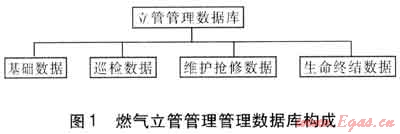 燃?xì)饬⒐芄芾硎且匀細(xì)庖牍軘?shù)據(jù)為基礎(chǔ)的。我們?cè)诔鞘忻裼萌細(xì)饬⒐艿墓芾眄?xiàng)目實(shí)施前以及實(shí)施過(guò)程中收集了大量的基礎(chǔ)數(shù)據(jù),以此建立基礎(chǔ)數(shù)據(jù)庫(kù);依據(jù)在運(yùn)行過(guò)程中因管道日常巡查、維修、更換、事故搶修等而產(chǎn)生的運(yùn)行數(shù)據(jù),建立運(yùn)行數(shù)據(jù)庫(kù)。通過(guò)開發(fā)專業(yè)的立管管理軟件將上述兩個(gè)數(shù)據(jù)庫(kù)資源進(jìn)行整合,形成一個(gè)完整的燃?xì)饬⒐芄芾頂?shù)據(jù)庫(kù)。工作人員運(yùn)用該專業(yè)管理軟件對(duì)基礎(chǔ)數(shù)據(jù)、日常巡查數(shù)據(jù)以及維護(hù)、更換、事故搶修事故數(shù)據(jù)進(jìn)行處理、分析,得出分析結(jié)果,依據(jù)分析結(jié)果采取相應(yīng)的響應(yīng)措施,并將數(shù)據(jù)進(jìn)行更新,不斷補(bǔ)充、完善整體數(shù)據(jù)庫(kù)[2]。立管管理數(shù)據(jù)庫(kù)系統(tǒng)構(gòu)成見圖1。