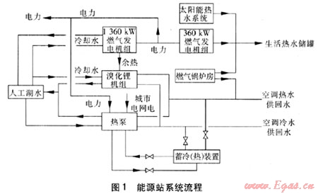 能源站設(shè)1路10kV高壓進(jìn)線,燃?xì)獍l(fā)電機(jī)組經(jīng)2臺(tái)容量為2000kVA變壓器升壓后分別接入10kV配電母線與市電并網(wǎng)運(yùn)行,每臺(tái)變壓器各接入1臺(tái)1360kW及1臺(tái)360kW燃?xì)獍l(fā)電機(jī)組。燃?xì)獍l(fā)電機(jī)組采用并網(wǎng)不上網(wǎng)的方式(或獨(dú)立運(yùn)行方式),在10kV進(jìn)線側(cè)設(shè)有逆功率保護(hù)裝置,防止向城市電網(wǎng)送電。燃?xì)獍l(fā)電機(jī)組發(fā)電在生態(tài)園范圍內(nèi)使用,除能源站設(shè)備用電外,用于生態(tài)園的為外供電量,不足部分由城市電網(wǎng)補(bǔ)充。為充分利用城市電網(wǎng)低谷時(shí)段電,并考慮夜間冷熱負(fù)荷較低,通常夜間燃?xì)獍l(fā)電機(jī)組不工作,熱泵利用城市電網(wǎng)低谷電進(jìn)行蓄冷、蓄熱,蓄冷熱裝置采用共用方式。能源站系統(tǒng)流程見圖1。