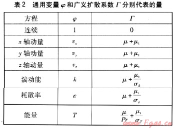 在各個控制方程中,通用變量φ和廣義擴(kuò)散系數(shù)Γ分別代表的量見表2。