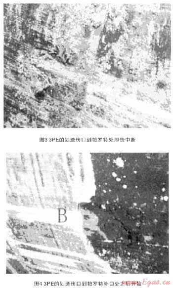 可以看到,管體3PE的劃透?jìng)诘脚亮_特補(bǔ)口處即告中斷,見圖3。也可看到,管體3PE的劃透?jìng)趶呐亮_特補(bǔ)口處之后開始,見圖4。