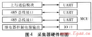 采集器的任務(wù)就是轉(zhuǎn)發(fā)集中器和燃?xì)獗碇g的通信數(shù)據(jù),并在抄讀燃?xì)獗淼臅r(shí)候短暫地給燃?xì)獗淼碾娮硬糠止╇?。采集器和集中器之間的通信采用了電力線載波通信方式。電力線載波通信有通信不穩(wěn)定、易受干擾的缺點(diǎn),但采集器只要在軟件上做些改進(jìn)就能極大地彌補(bǔ)這一缺點(diǎn),例如能短時(shí)間地儲(chǔ)存燃?xì)獗淼臄?shù)據(jù)。這樣當(dāng)給集中器返回的燃?xì)獗頂?shù)據(jù)因信道不穩(wěn)定而丟失時(shí),集中器再次下發(fā)抄這塊表的數(shù)據(jù)時(shí),采集器就不用再去抄燃?xì)獗砹耍呛芸斓刂苯臃祷夭杉鲀?chǔ)存的數(shù)據(jù),這樣就使抄表成功率大大提高。采集器也要求采用可更換的通信模塊,儲(chǔ)存容量不需要太大,采集器MCU要有至少3個(gè)UART,還要有給燃?xì)獗砉╇妴卧?。采集器的硬件框圖見(jiàn)圖4。MCU的1個(gè)UART和上行通信模塊相連,2個(gè)UART設(shè)計(jì)成RS485總線。這2個(gè)RS485接口,1個(gè)是和燃?xì)獗硗ㄐ庞茫?個(gè)保留和集中器通信。如果采集器和集中器距離很近,就用保留的RS485接口直接和集中器相連。同時(shí)MCU控制1個(gè)繼電器給直讀式燃?xì)獗淼碾娮硬糠止╇姟?/span>
