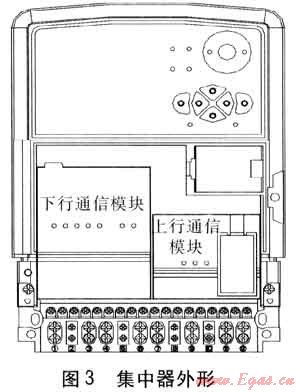 集中器外殼選用國(guó)家電網(wǎng)公司企業(yè)標(biāo)準(zhǔn)Q/GDW 375.2—2009《電力用戶用電信息采集系統(tǒng)型式規(guī)范:集中器型式規(guī)范》中的集中器外殼。外形見(jiàn)圖3??梢钥吹?,這個(gè)外殼上面有上行通信模塊和下行通信模塊兩個(gè)小盒子,這兩個(gè)小盒子采用了可插拔設(shè)計(jì)。左邊小盒子是和采集器通信的通信模塊,右邊小盒子是和主站通信的通信模塊。集中器在設(shè)計(jì)時(shí)先規(guī)定好集中器和這兩個(gè)通信模塊之間的通信協(xié)議和物理層的接口,所有通信模塊的設(shè)計(jì)都遵守這個(gè)協(xié)議。根據(jù)現(xiàn)場(chǎng)選擇通信方式的不同更換不同的通信模塊,這樣就大大提高產(chǎn)品的適應(yīng)能力。
