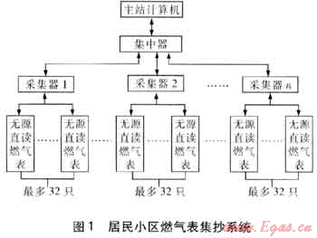 居民小區(qū)燃?xì)獗砑到y(tǒng)見(jiàn)圖1。系統(tǒng)由3部分組成,即燃?xì)獗?、集抄設(shè)備和主站。與傳統(tǒng)方式不同的是集抄設(shè)備不再是集中器一種設(shè)備,而是由集中器和采集器組成。集中器每天或每月輪抄1遍所轄的燃?xì)獗?,這個(gè)過(guò)程需要通過(guò)采集器轉(zhuǎn)發(fā)配合完成。集中器把數(shù)據(jù)保存在儲(chǔ)存器中然后等待主站發(fā)命令讀取。主站每天或每月定時(shí)讀取集中器內(nèi)的數(shù)據(jù),也可以通過(guò)集中器和采集器實(shí)時(shí)地讀取燃?xì)獗淼臄?shù)據(jù)。這個(gè)系統(tǒng)中燃?xì)獗磉x用無(wú)源直讀燃?xì)獗怼?/span>