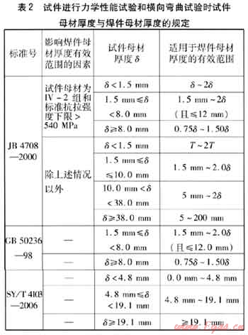 試件進(jìn)行力學(xué)性能試驗(yàn)和橫向彎曲試驗(yàn)時(shí)試件厚度與焊件母材厚度的規(guī)定見(jiàn)表2。