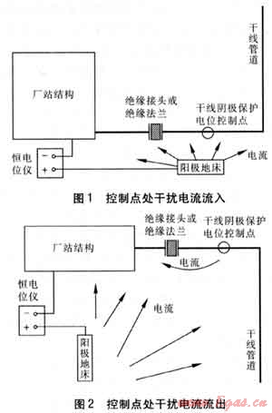 站內(nèi)陰極保護電流一般通過影響站外干線陰極保護系統(tǒng)控制點來對其造成干擾。由于國內(nèi)大多數(shù)干線管道陰極保護系統(tǒng)采用恒電位控制方式,而電位信號反饋點即陰極保護電位控制點通常距離站內(nèi)金屬結構較近,因此易受到站內(nèi)陰極保護系統(tǒng)的影響,引起極化增加或去極化而影響控制系統(tǒng)的信號反饋,從而使干線保護系統(tǒng)的輸出電流降低或增加,干線陰極保護水平相應受到影響。通常干擾有兩種類型:一是控制點處有干擾電流流入,導致極化增加,見圖1,為維持設定的控制電位,干線陰極保護系統(tǒng)輸出電流將自動下降,導致整個管道陰極極化程度降低,遠端易保護不足;二是控制點處有干擾電流流出,導致極化減小,見圖2,為維持設定的控制電位,干線陰極保護系統(tǒng)輸出電流將自動提高,導致整個管道陰極極化加大,近端易產(chǎn)生過保護。