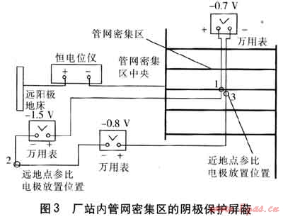 ① 廠站內(nèi)由于埋地金屬構件的多樣性和復雜性,要準確地確定實際所需的保護電流,僅通過經(jīng)驗估計的方法是難以滿足要求的,推薦采用饋電試驗法進行現(xiàn)場測試。在陰極保護技術實施過程中若能采用極化電池將埋地管網(wǎng)與接地系統(tǒng)隔離,將會大大減小陰極保護電流,減弱或消除干擾和屏蔽問題。