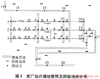 例如,某天然氣輸送廠站采用淺埋分布式陽極地床進行陰極保護,站內(nèi)埋地管網(wǎng)和淺埋陽極的分布見圖4。