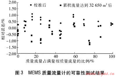 用于城市天然氣計量的質(zhì)量流量計,其可靠性十分重要,可靠性故障會給燃氣管理帶來困難,甚至引起貿(mào)易糾紛。在MEMS質(zhì)量流量計的可靠性測試中,采用了加速實驗的方法。一臺管徑為32mm,最大標稱流量為16m3/h的MEMS質(zhì)量流量計在校準后和累積流量達到32650m3后的質(zhì)量流量相對誤差見圖3,同一工況、同一質(zhì)量流量下的3個相對誤差值代表3次重復性測量的結(jié)果(圖3中有些點重合)。該MEMS質(zhì)量流量計適用于小型餐飲用戶等的天然氣計量,這類用戶平均每天用氣約6h,平均小時流量約為8m3/h,因此32650m3的天然氣約需要使用2年。由圖3可知,累積使用2年后,MEMS質(zhì)量流量計的測量精度仍能滿足要求。