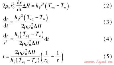 由以上分析可知,首先在液-液分界面處形成一個球形水合物膜層,水和客體物質分別通過水合物膜層向兩側擴散以便相互接觸,促進水合物的生長。假設此時水合物向兩側的生長率相同,即rh=r0+dr,rb=r0-dr,當t=0時,r=r0,則由式(1)得到式(2)~(5)。