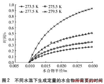 以制冷劑HCFC-141b作為客體物質進行計算,計算中取HCFC-141b的量為1mol。計算得知初始時刻r0為9.7mm,依據(jù)理論參數(shù),計算了不同水溫下生成定量水合物所需要的時間,見圖2。