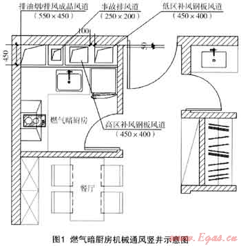 第二方案,燃?xì)獍祻N房設(shè)置排油煙系統(tǒng)、事故排風(fēng)系統(tǒng)、補(bǔ)風(fēng)系統(tǒng):燃?xì)庑孤﹫?bào)警及排油煙/排風(fēng)機(jī)出現(xiàn)故障時(shí),聯(lián)動(dòng)切斷燃?xì)夤艿拦?yīng)的總閥門,所有通風(fēng)設(shè)備均為防爆設(shè)備。采用了很多主動(dòng)技術(shù)來加強(qiáng)通風(fēng),如圖1、圖2所示: