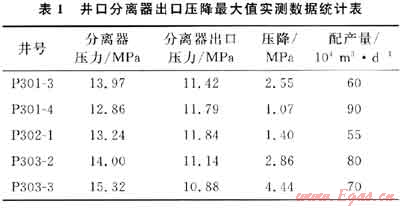 普光氣田開發(fā)井生產(chǎn)后,8臺井口分離器都頻繁出現(xiàn)過出口壓差過大的現(xiàn)象,其中5臺最嚴重,壓降最高時達4.44MPa,井口分離器出口壓降最大值實測數(shù)據(jù)統(tǒng)計表見表1。