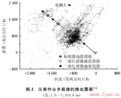 為了增加裂縫和氣層的接觸面積以提高氣井的初始產(chǎn)氣量和采收率,目前一般采用10~20級的壓裂以增加裂縫的連通。通過井場實時微地震來進行監(jiān)控(圖2),可以確定井眼東西和南北方向的裂縫頂端的方位,并且隨著壓裂作業(yè)的進行而跟蹤裂縫的形成過程。裂縫垂向的延伸具有特別重要的作用,作業(yè)者需要特別關注確保裂縫沒有延伸到頁巖層之外或者鄰近的水層中去,不然會使頁巖氣井的經(jīng)濟效益減少。