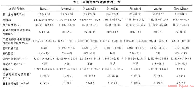 目前發(fā)現(xiàn)的頁巖氣藏主要穿過了南部的48個州(除阿拉斯加和夏威夷外),最活躍的頁巖氣藏是Barnett、Haynesville、Marcellus、Antrim、Eagle Ford和New Albany等氣藏。表1總結了美國優(yōu)選頁巖氣藏的地質參數(shù)。表2不僅提供了頁巖氣儲層的地質參數(shù),而且給出了通過對比某些關鍵參數(shù)評估頁巖氣盆地的方法。這些參數(shù)也應用在頁巖氣井的完井設計中。