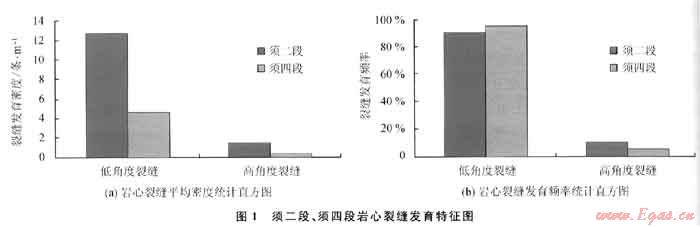 該區(qū)須家河組以發(fā)育低角度裂縫為主,發(fā)育密度大致是高角度裂縫的10倍,出現(xiàn)頻率超過(guò)90%。無(wú)論是低角度還是高角度裂縫,須二段都較須四段更自發(fā)育,其裂縫平均密度顯著大于須四段(表1、圖1)。