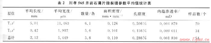 為了說(shuō)明薄片裂縫的分布特征,尤其是須二段和須四段裂縫發(fā)育和分布的差異性,選取裂縫較為發(fā)育的川孝565井,對(duì)薄片中裂縫進(jìn)行了系統(tǒng)鑒定和統(tǒng)計(jì),據(jù)Cmexoba等于1962年提出的薄片微裂縫各項(xiàng)指標(biāo)的計(jì)算公式[18],計(jì)算微裂縫的各項(xiàng)特征參數(shù)并求取平均值(表2)。