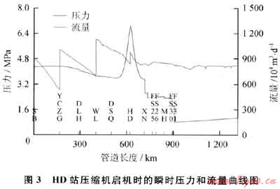 HD站壓縮機(jī)啟機(jī)時的瞬時壓力和流量趨勢如圖3所示。從圖3中可以看出,HD站壓縮機(jī)啟機(jī)后,該站的天然氣通過量瞬間提高的幅度非常大,上下游的流量上升速度均較快,入站壓力下降,出站壓力上升。長此以往將影響到上游壓縮機(jī)的運行、下游用戶的分輸量以及全線的輸氣量,最后,全線工況會穩(wěn)定到如圖1所示的狀態(tài)。