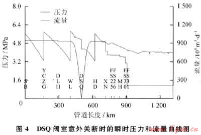 輸氣管道干線截斷閥(DSQ閥室)意外關(guān)斷時,管道的瞬時壓力和流量趨勢如圖4所示。從圖4可以看出,DSQ閥室意外關(guān)斷后,該閥室的天然氣通過量瞬間下降至零,上下游的流量下降均較快,入站壓力上升,出站壓力下降。長此以往將影響到上游壓縮機(jī)的運行、下游用戶的分輸量以及全線的輸氣量,最后導(dǎo)致全線停運。