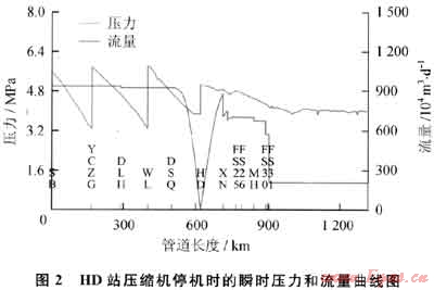HD站壓縮機(jī)停機(jī)的瞬時壓力和流量趨勢如圖2所示。從圖2可以看出,HD站壓縮機(jī)停機(jī)后。該站的天然氣通過量瞬間下降至0,上下游的流量下降均下降較快,入站壓力上升,出站壓力下降。長此以往將影響到上游壓縮機(jī)的運行、下游用戶的分輸量以及全線的輸氣量。